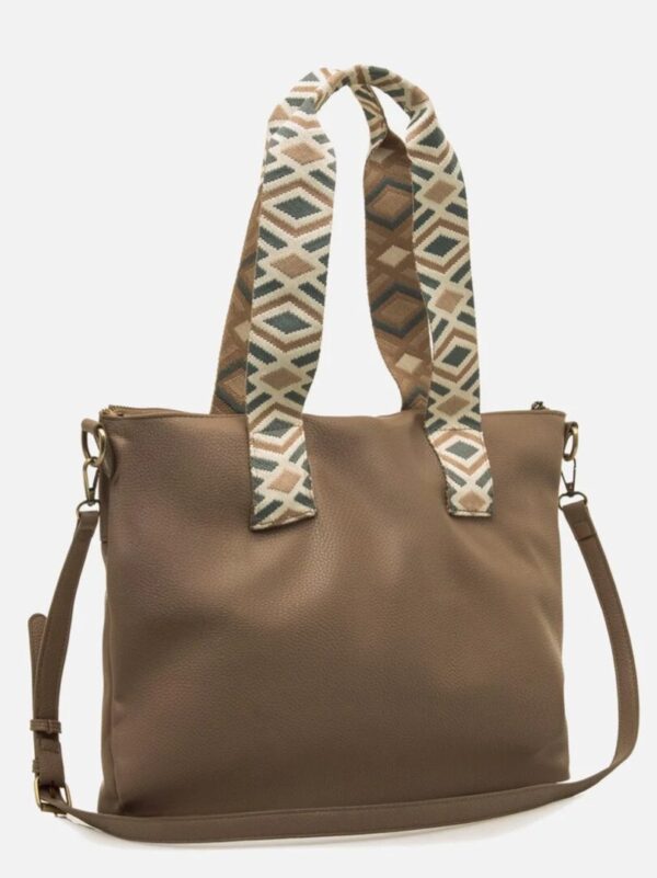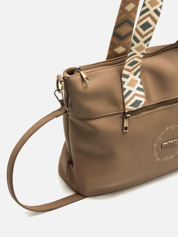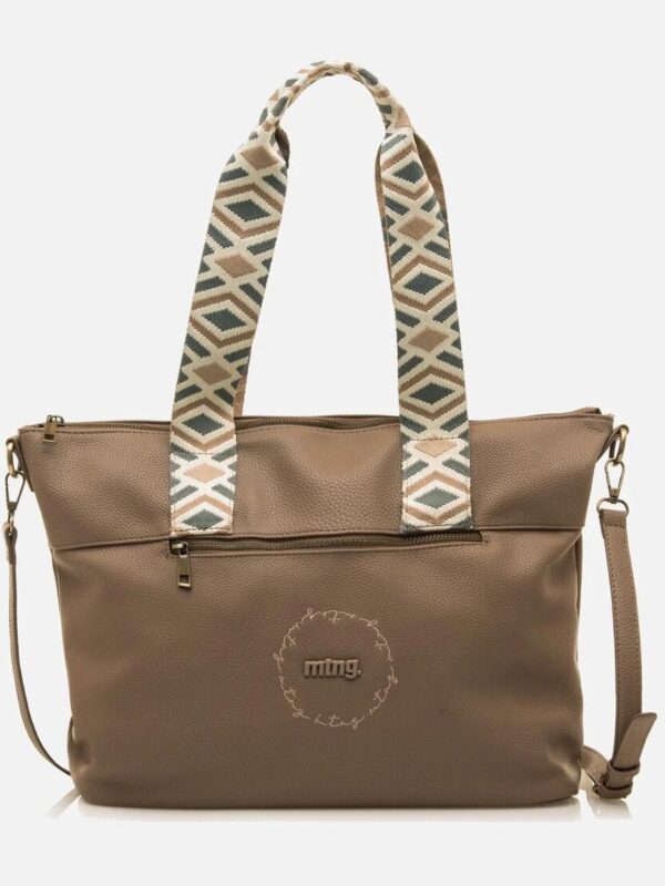 Bolso shopper, tamaño grande, en color taupe de la firma Mustang. Modelo fabricado en sintético de textura granulada con asas largas de estampado geométrico. Incluye también una correa larga, ajustable, para poder usar como bandolera. Diseñado con cierre superior de cremallera y un bolsillo frontal, cuenta en su interior, con forro estampado de estrellas, con tres bolsillos mas, uno de ellos cerrado con cremallera.