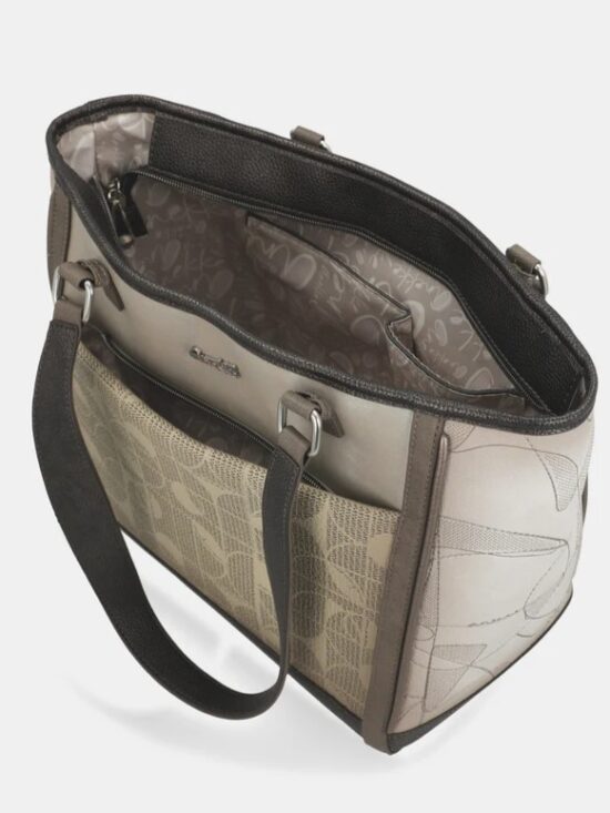 Bolso tipo tote, de tamaño grande, con cierre superior de cremallera y diseñado con dos asas amplias para lucir en el hombro. Dispone de dos amplios bolsillos exteriores, uno delante y otro detrás, cerrados con cremallera y tres más en su interior para llevar organizadas esas pequeñas cosas que necesitas en el día a día.