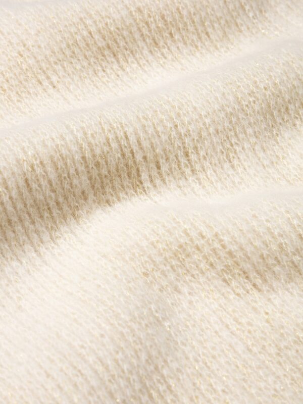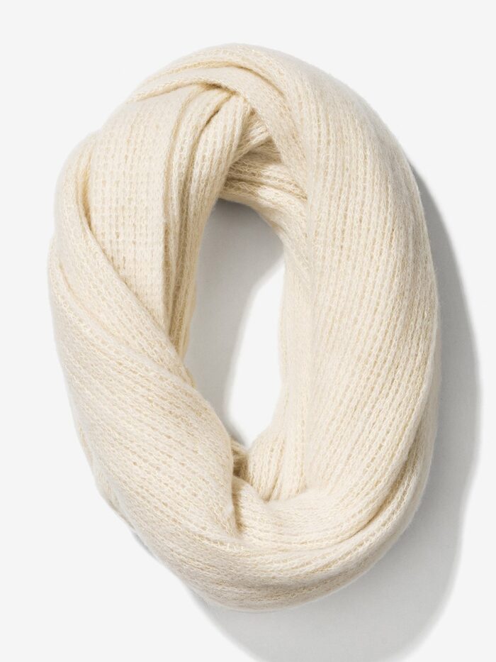 Bufanda cerrada, tipo cuello, en color beige de punto tricotado con incrustación de hilo metalizado. Modelo de textura suave y diseño tubular moderno que aporta un toque cálido y acogedor.
