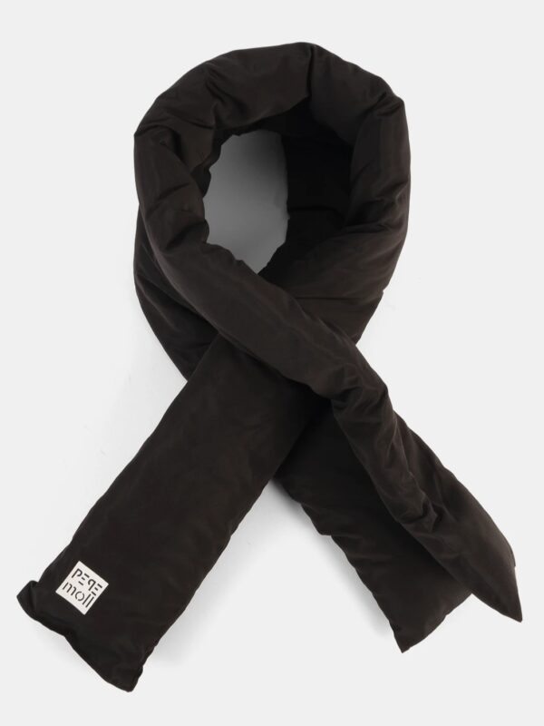 Bufanda, tipo cuello, de la firma Pepe Moll. Modelo diseñado con dos cámaras acolchadas y fabricada en tejido sintético con un acabado liso y mate, ligeramente satinado, con un relleno interior que aporta calidez sin añadir peso. Su forma rectangular y longitud media permiten llevarla cruzada sobre el pecho o anudada al cuello.