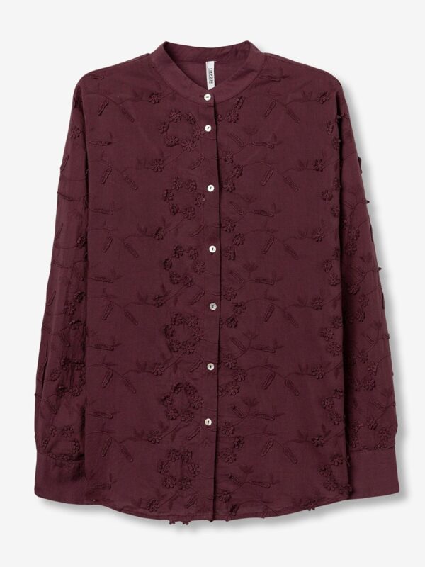 Camisa en tono burdeos con cuello mao y manga larga. Modelo con bordado floral, en la parte delantera y en las mangas, y cierre frontal con botones.