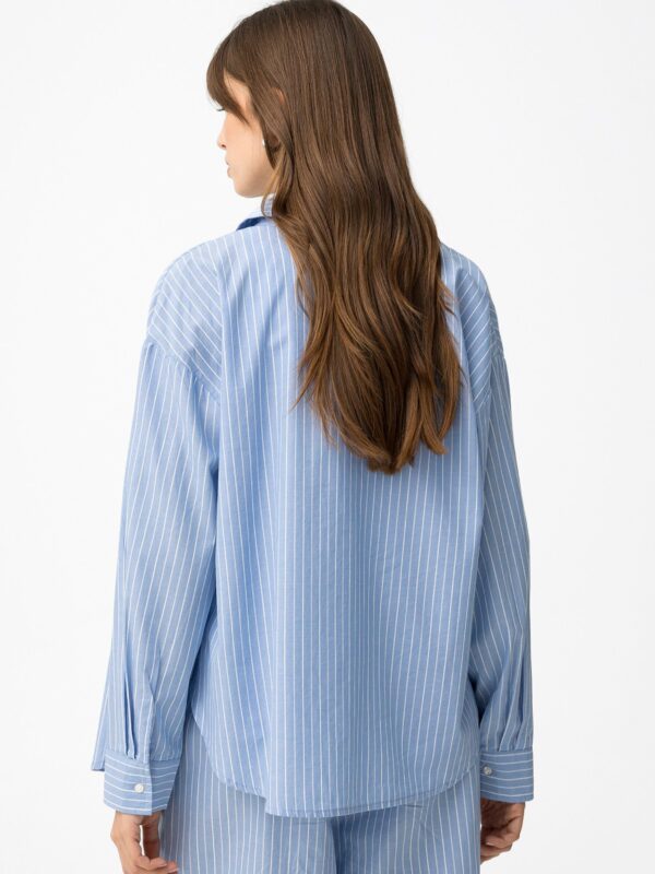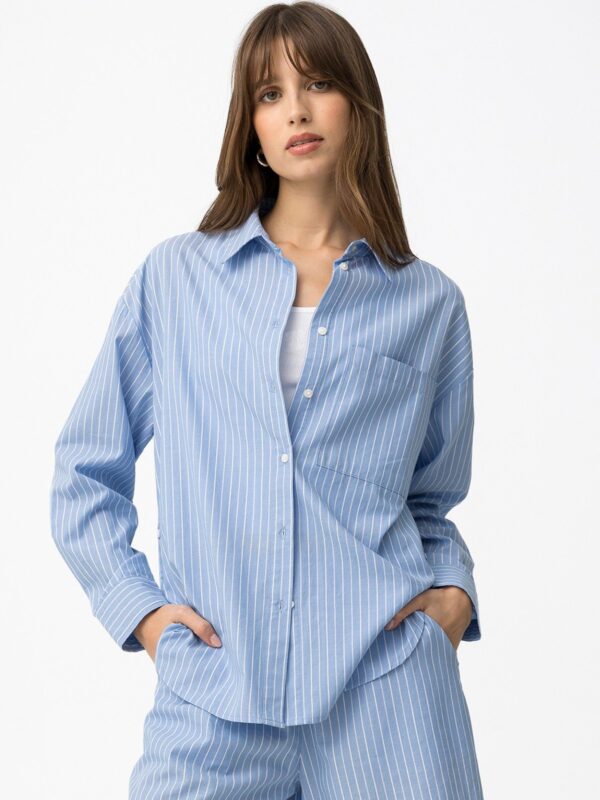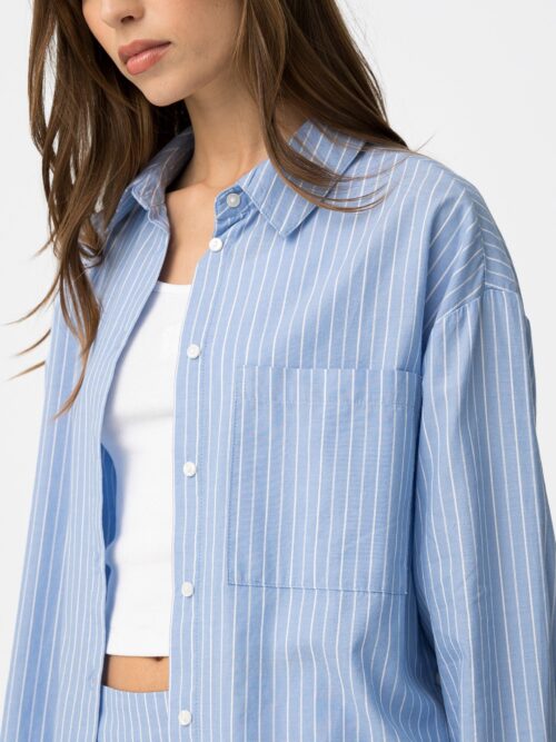 Camisa de manga larga, confeccionada en algodón, en color azul con estampación de rayas blancas. Modelo diseñado con bolsillo y aberturas abotonadas en ambos lados. Diseño actual con un toque diferente.