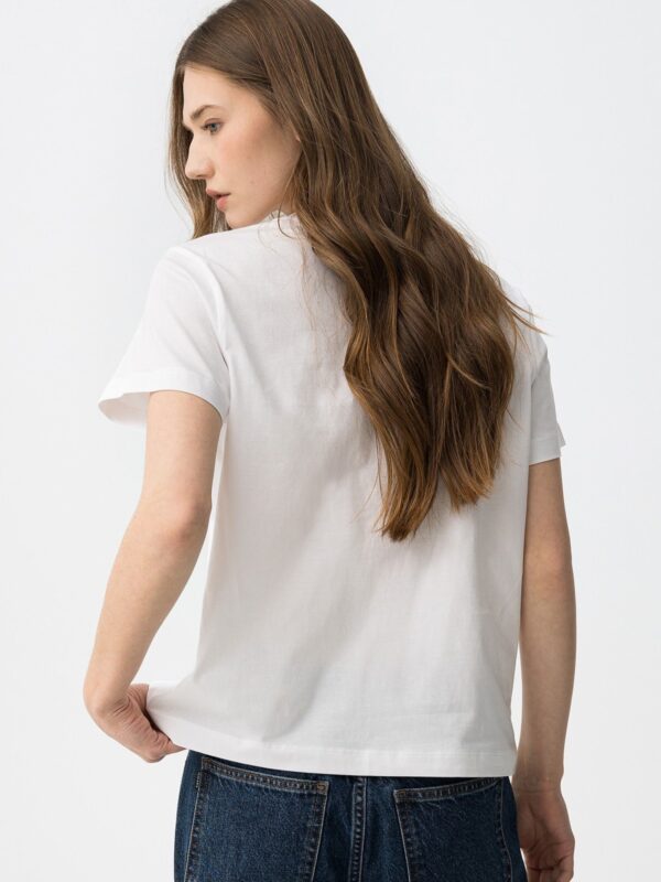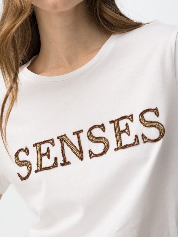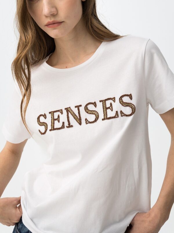 Camiseta de algodón con cuello redondo y manga corta. Modelo diseñado con texto cosido, hecho de pequeñas cuentas, en el frontal y con la espalda lisa.