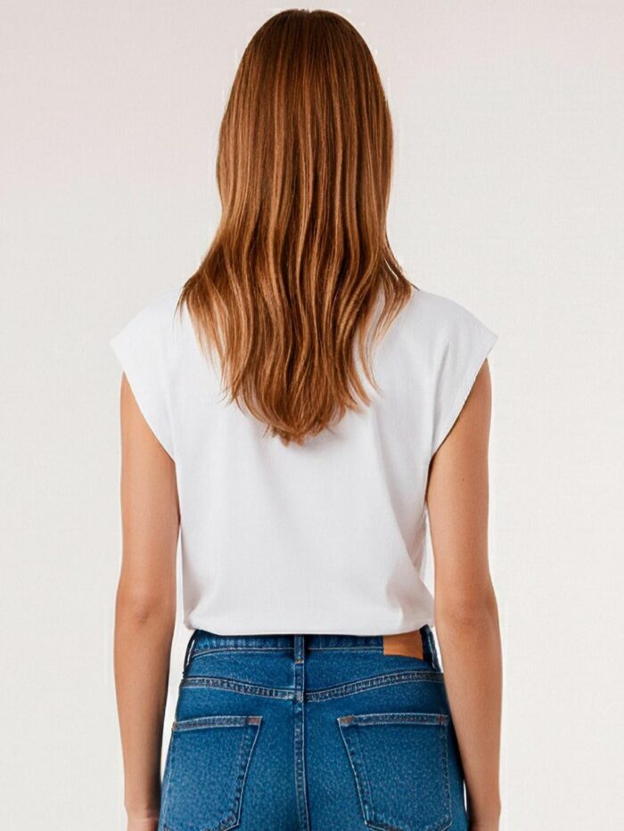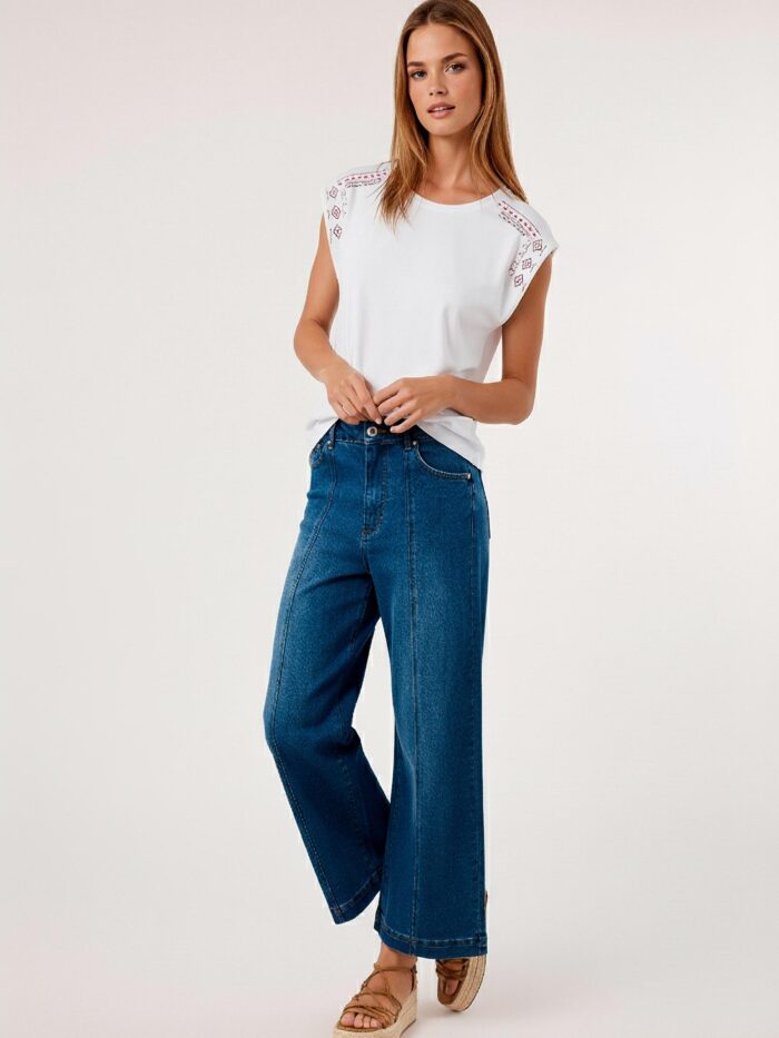 Camiseta con cuello redondo y mangas sisa de la firma Dandara. Modelo de corte clásico y diseñada con aplique de cuentas de cristal, cosidas sobre los hombros y mangas, en diferentes formas y colores. Una básica, con un toque fresco, ideal para combinar con jeans, faldas vaqueras, etc…. para un look diferente.