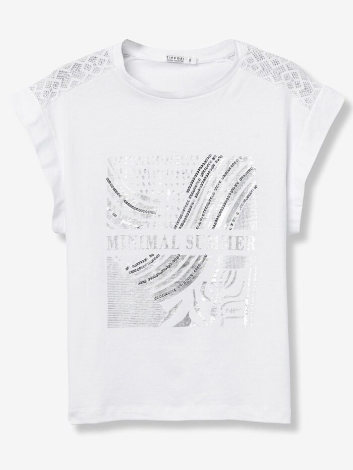 Camiseta blanca, de algodón, de la firma Tiffosi. Modelo de corte regular con manga sisa y detalle de encaje en los hombros. Diseñada con texto de textura metalizada estampado en el frontal y trazos con lentejuelas cosidas en color plateado.