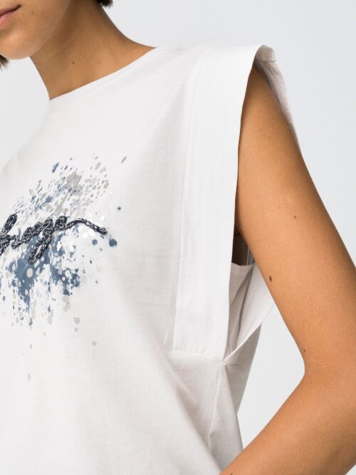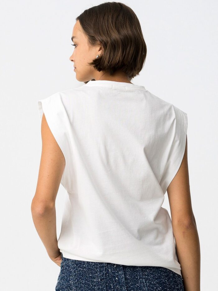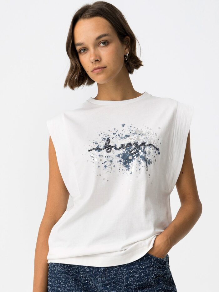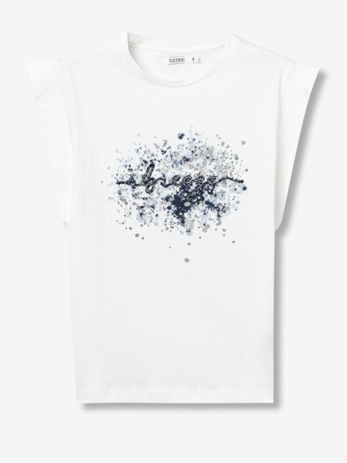 Camiseta de algodón de la firma Tiffosi. Modelo de manga sisa y cuello redondo, con texto de cuerda, cosido en el frontal, sobre fondo metalizado.