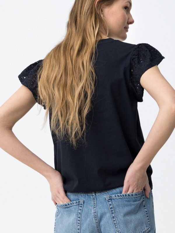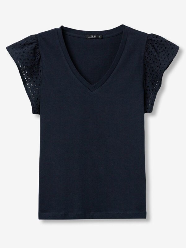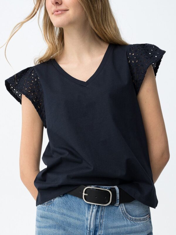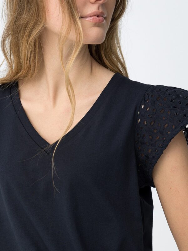 Camiseta en color azul marino, de corte regular, con escote en pico y manga corta. Modelo básico pero con un toque diferente que le da el calado en las mangas.