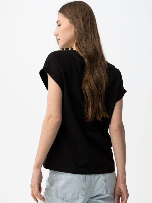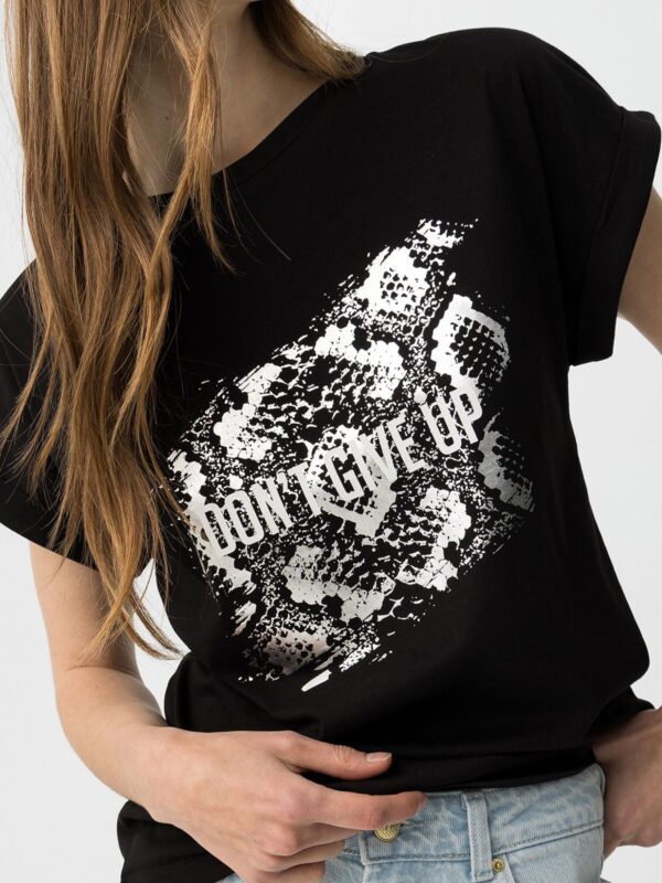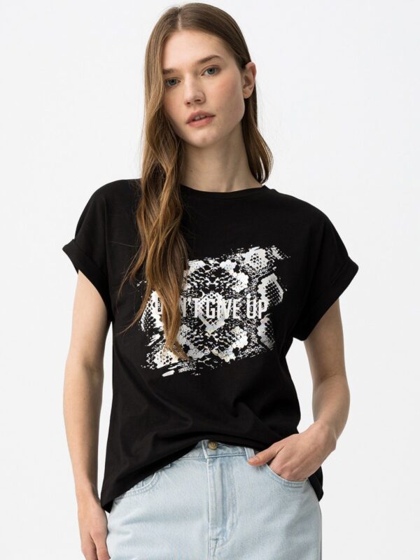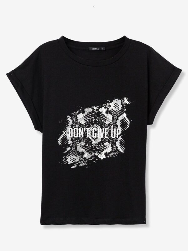Camiseta confeccionada en algodón, de corte regular, de la firma Tiffosi. Modelo de cuello redondo y manga corta y diseñado con estampado y texto en tono plateado de textura metalizada. Detalle de vuelta en las mangas.