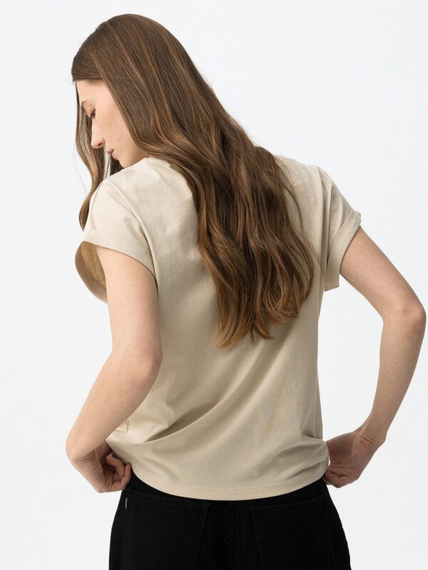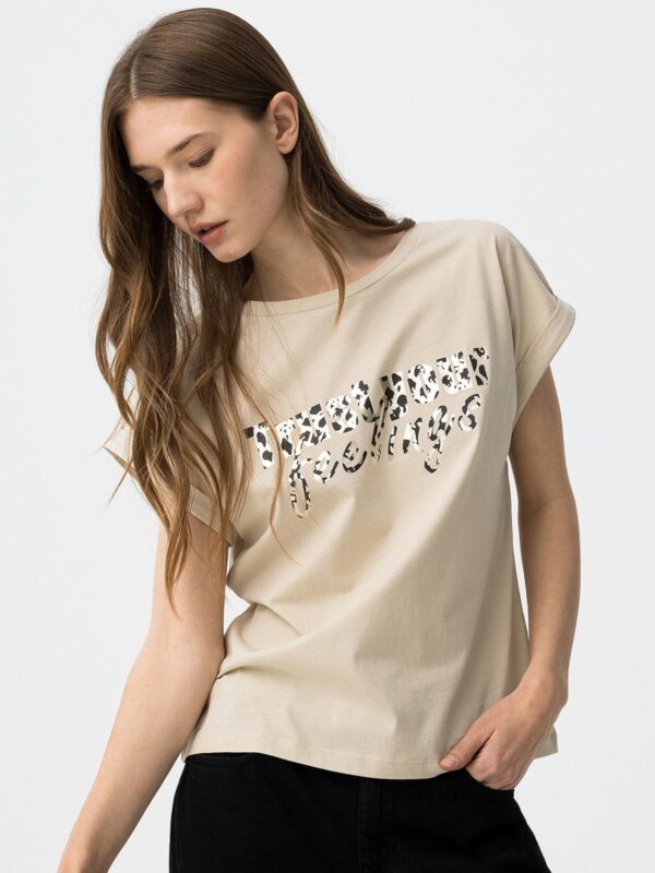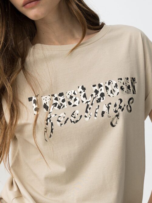 Camiseta de algodón con cuello redondo y manga corta con vuelta. Modelo con estampación metalizada en oro y negro de estilo animal print. Una básica con un toque salvaje para el día a día.