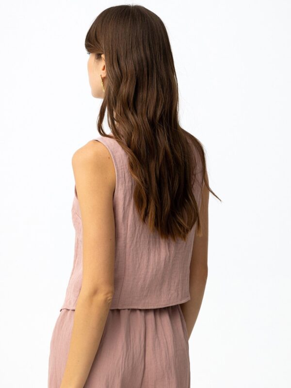Chaleco fresco y cómodo en tono rosa maquillaje, de la marca Tiffosi, con costuras delanteras y dos pinzas a la altura del pecho para realzar la figura. Su diseño te permite llevarlo abotonado para un look mas clásico o abierto sobre una camiseta para un estilo mas casual.