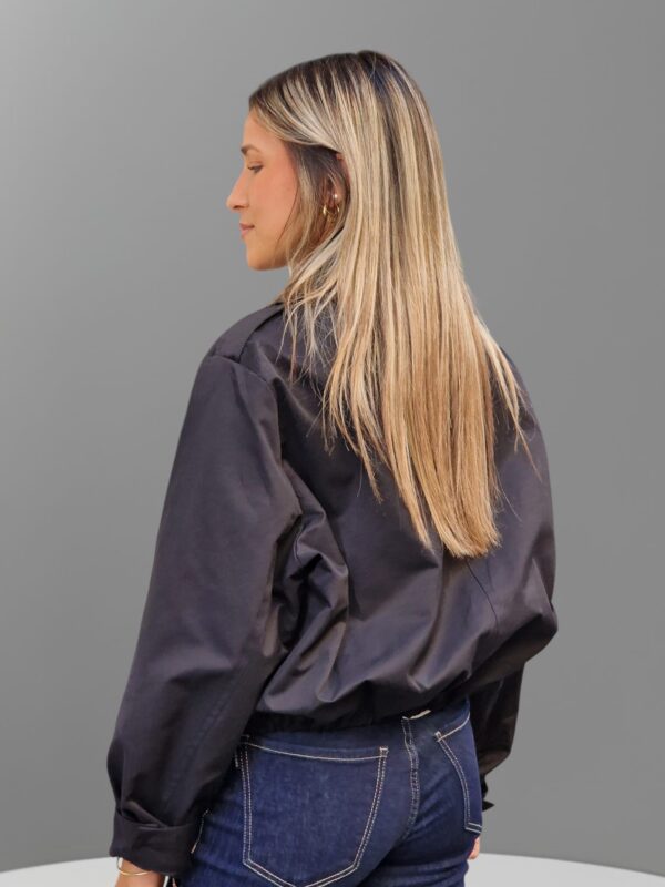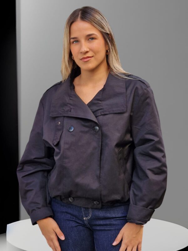 Chaqueta negra, de cierre cruzado con botones y cuello solapa. Modelo diseñado con bolsillos delanteros y cintura elástica para un ajuste mas cómodo.