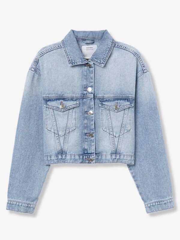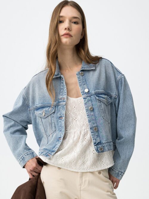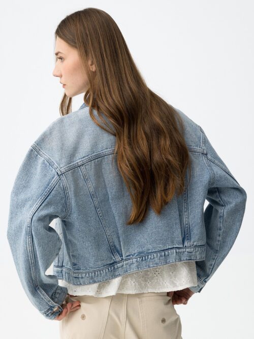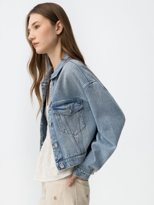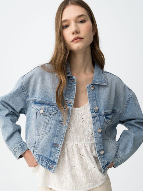 Chaqueta corta de corte oversize confeccionada en tejido vaquero. Modelo cerrado en el frontal con botones metálicos y diseñado con dos bolsillos con solapa en el pecho. Esta chaqueta es una prenda versátil y atemporal que no puede faltar en ningún armario. Su tono deslavado la hace ideal para un look casual y moderno combinándola con vestidos y faldas o pantalones de talle alto.