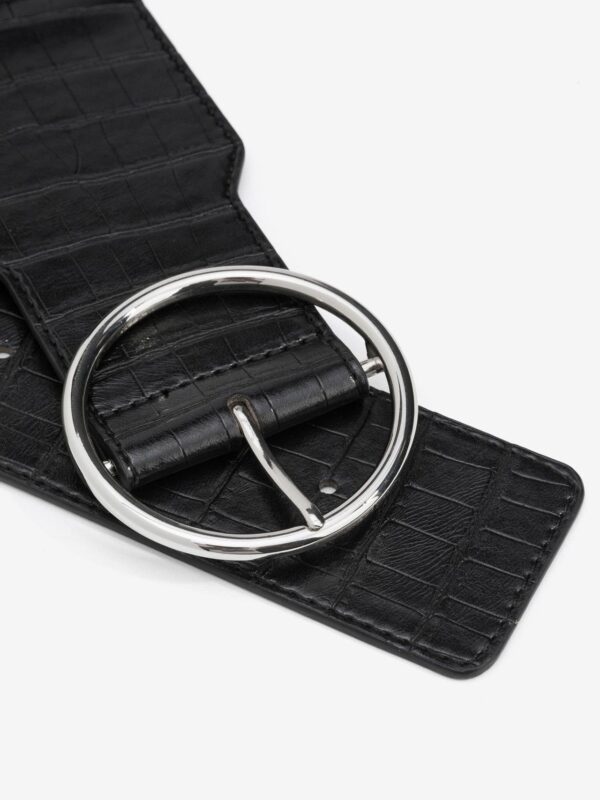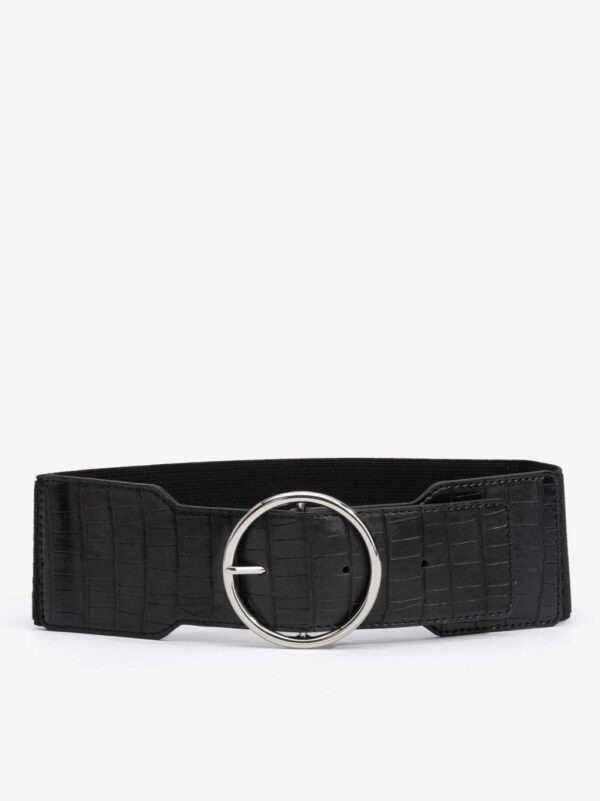 Cinturón elástico con los extremos en sintético efecto cocodrilo y cierre de hebilla redonda.
