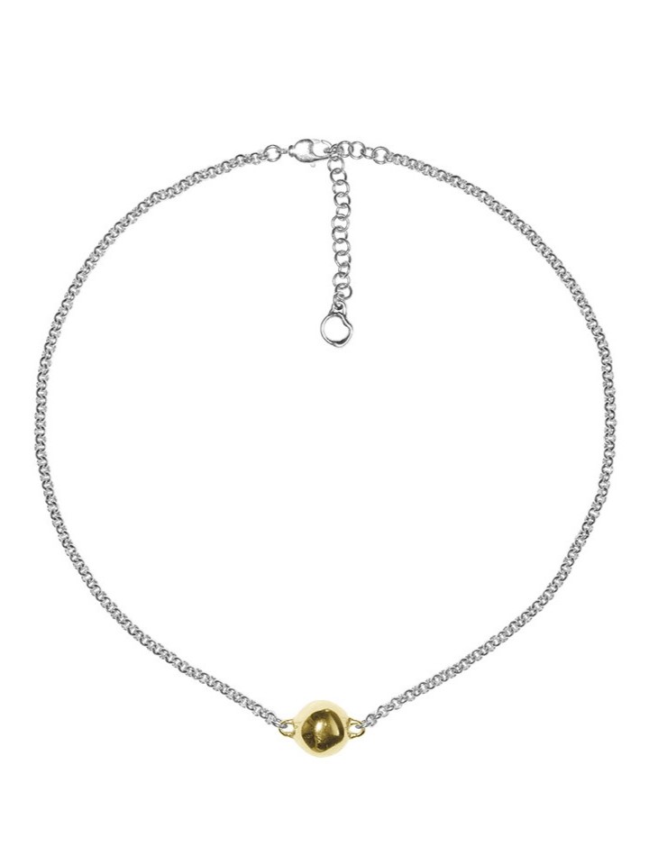Collar formado por una cadena corta de eslabones finos, bañada en plata, y un motivo central en forma de esfera bañada en oro. Modelo con cierre de mosquetón y longitud ajustable de 40 a 47 cm.