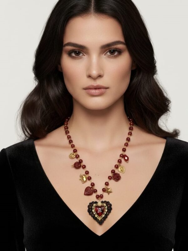 Collar corto (50 cm.) de bolitas de cristal enlazadas con eslabones de acero y adornado con diferentes figuras en dorado y burdeos. Detalle de colgante de corazón de diferentes texturas. Cierre de mosquetón con 5 cm. de cadena para regular.