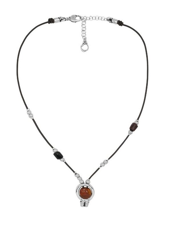 Collar con base de cordón de cuero adornada con pequeñas bolitas de cristal en tonos negro y plata con un motivo bañado en plata que enmarca un cristal de Murano en un elegante tono marrón muy en tendencia. Con cierre de mosquetón y medida ajustable de 40 a 45 cm, este collar corto es perfecto para quienes buscan una joya con carácter artesanal y espíritu alegre.