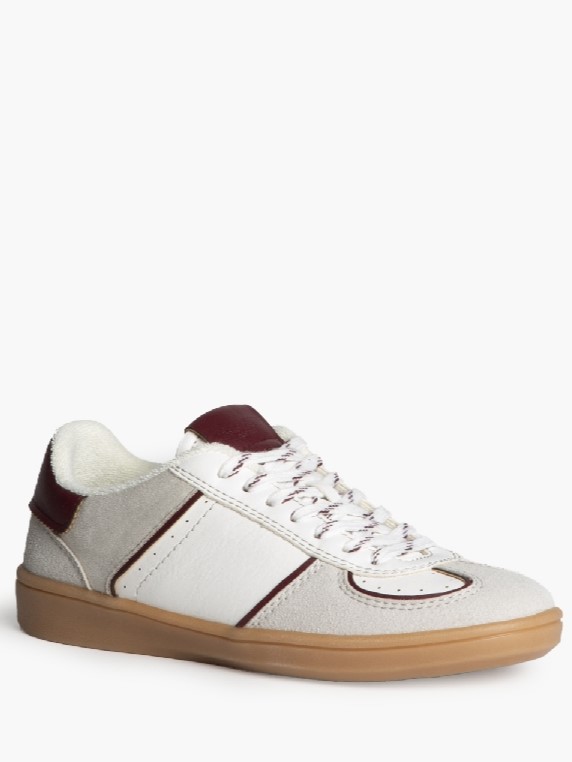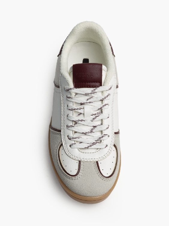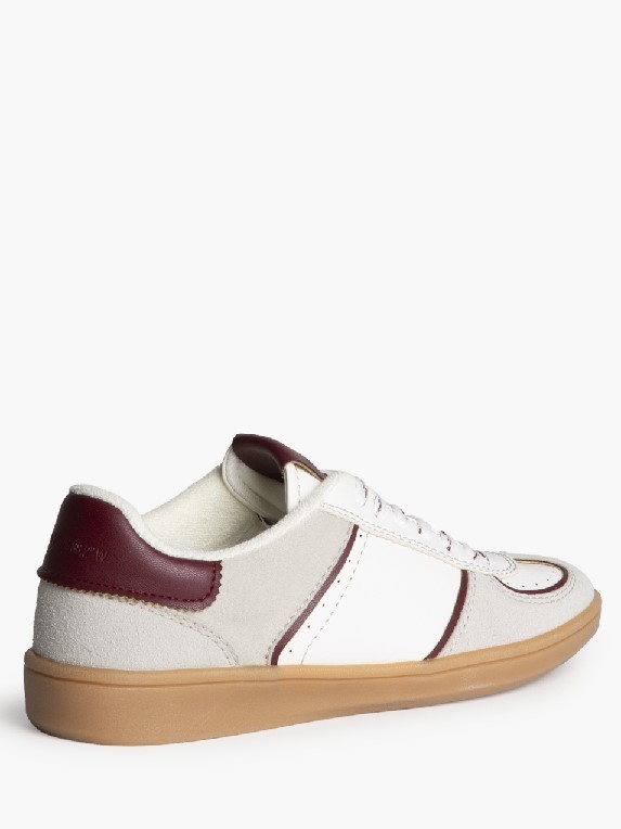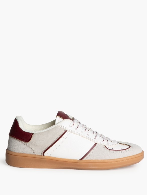 Deportivos de estilo retro con cierre mediante cordones de siete pasadas. Modelo de corte en combinación de materiales con el fondo blanco y detalles en color burdeos. La suela de goma ofrece una pisada cómoda y con un agarre que aporta seguridad.