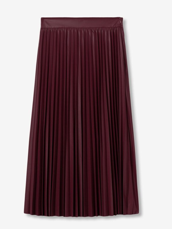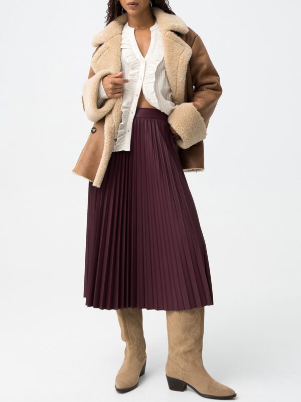 Falda midi plisada, efecto piel, con cintura lisa y diseñada con cierre de cremallera «invisible» en el lateral. Modelo con mucho estilo para diferentes looks.