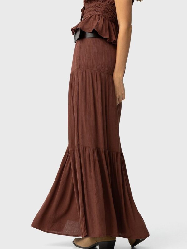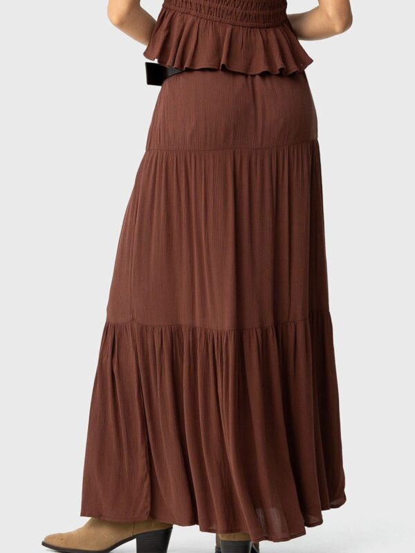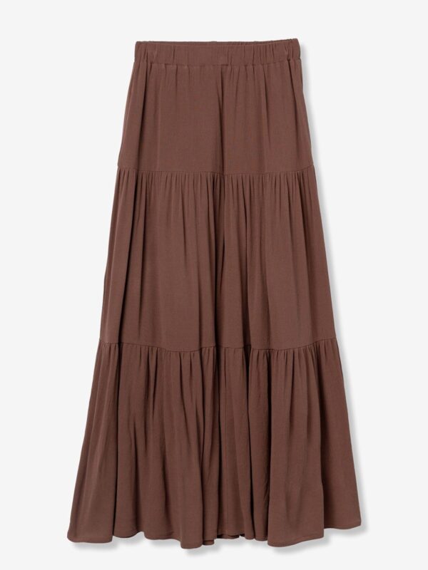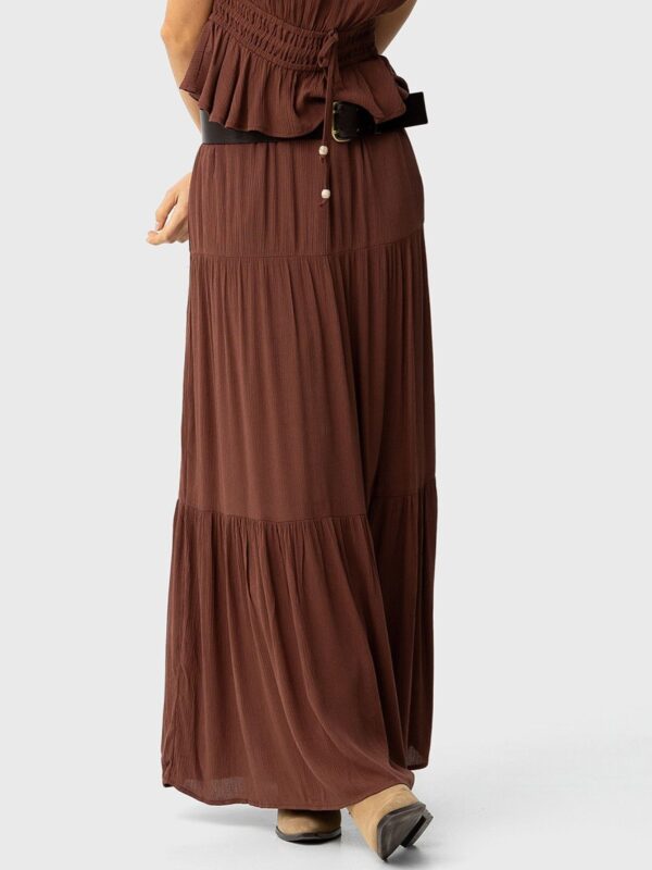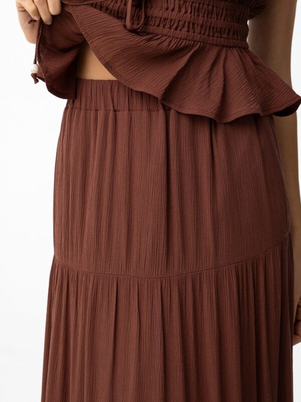 en color marrón chocolate de Tiffosi. Modelo con cintura elástica y diseñado con diferentes capas que terminan con frunces en la parte inferior. Cuenta con forro interior hasta media pierna que aporta comodidad a la hora de lucirla con el look elegido.