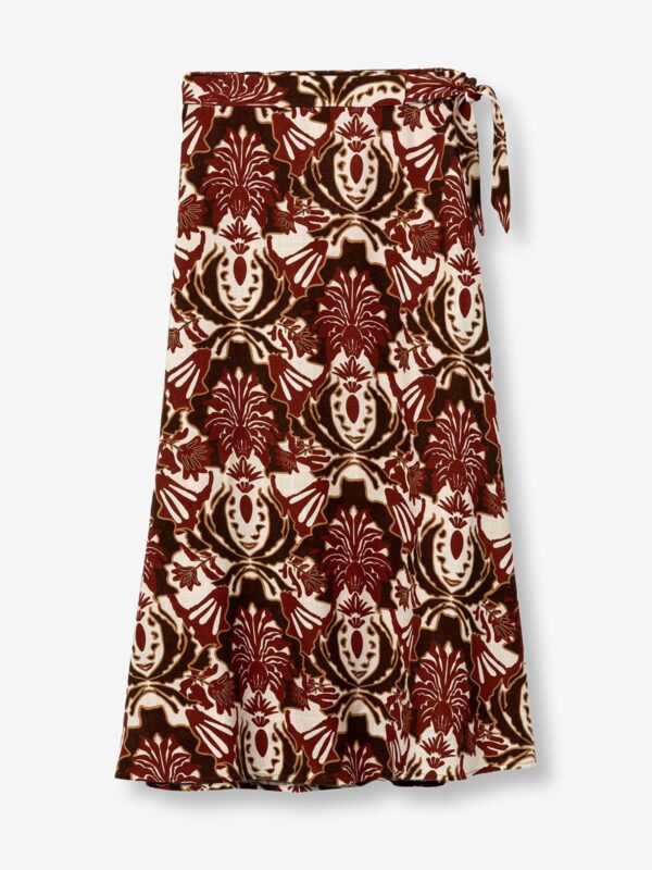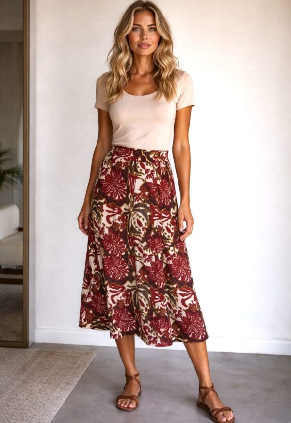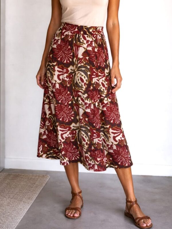 Falda midi, de corte fluido, con una estampación floral en tonos granate, marrón oscuro y beige. Modelo confeccionado en tejido con cuerpo y diseño ajustado en cintura y vuelo en el bajo. Su cierre es con cremallera «invisible» en un lateral acompañado de cintas del mismo estampado para lazada en la cintura.