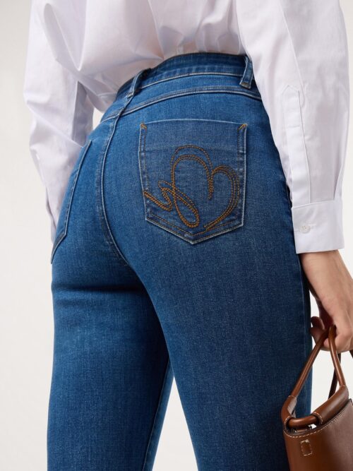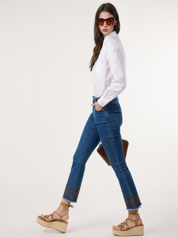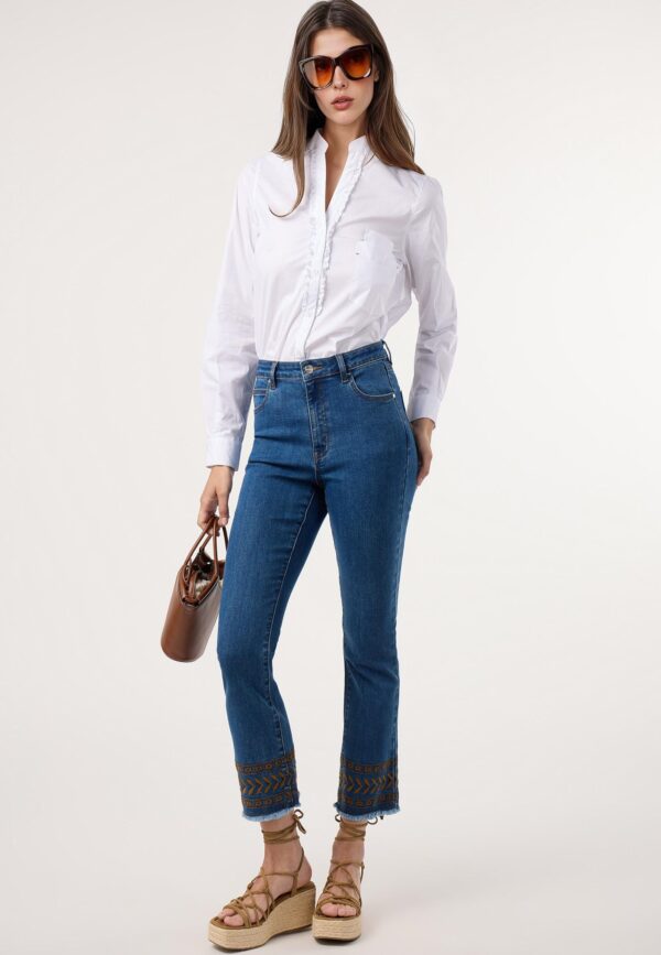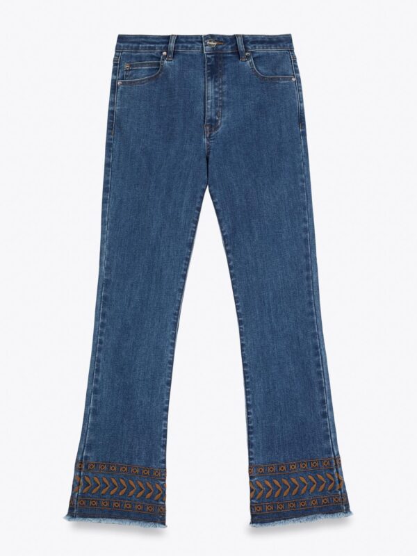 Vaqueros de tiro alto y diseño de cinco bolsillos con cierre frontal de cremallera y botón metálico. Modelo de estilo moderno, con pernera recta y detalle de bordado geométrico en ambos bajos y en uno de los bolsillos traseros. Camal con terminación desflecada para darle un toque desenfadado.