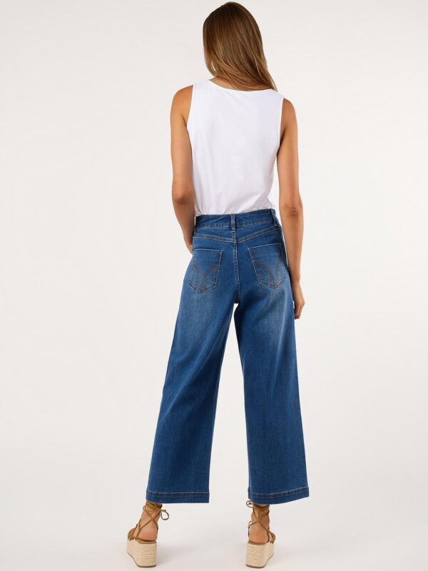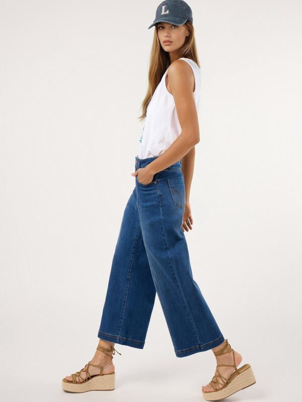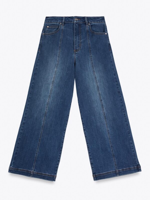 Vaqueros de tiro alto y diseño de cinco bolsillos con cierre frontal de cremallera y botón metálico. Modelo de estilo moderno, con pernera ancha y costura frontal en ambas piernas, que combina perfectamente la elegancia y la comodidad del pantalón vaquero.