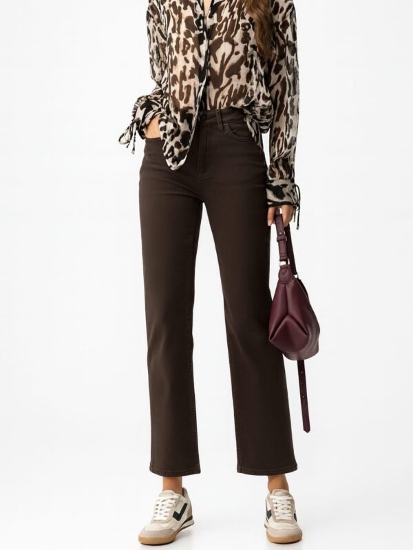 Jeans de tiro alto con cinco bolsillos y pernera flare. Modelo con cierre frontal de cremallera y botón metálico. Detalle de bajo con terminación desflecada.