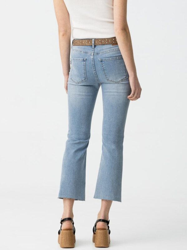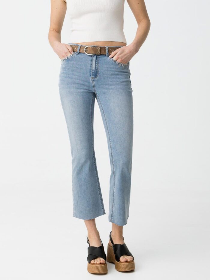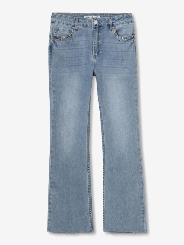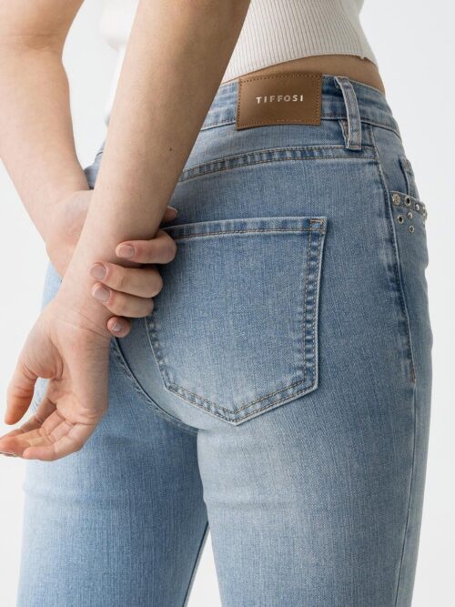 Jeans de tiro alto de la firma Tiffosi. Modelo de cinco bolsillos, con aplique de tachas y remaches en los bolsillos delanteros, con cierre frontal con cremallera y botón metálico. Detalle de bajo deshilachado.