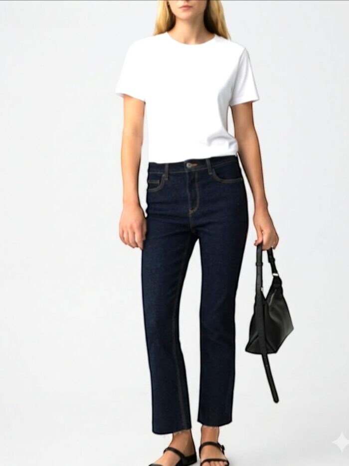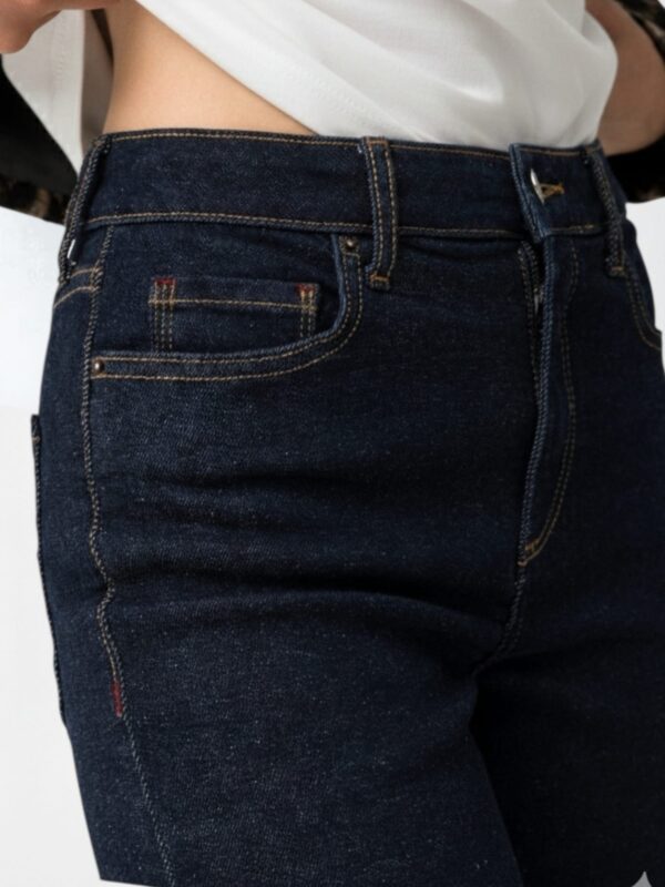 Jeans de tiro alto con cinco bolsillos y pernera flare. Modelo con cierre frontal de cremallera y botón metálico. Detalle de bajo con terminación cortada al láser.
