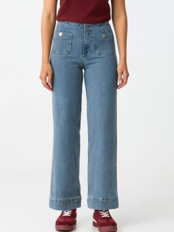 Jeans tiro alto de pierna recta y ancha para un ajuste cómodo. Modelo de cuatro bolsillos, los delanteros de tipo parche, con cierre frontal con cremallera y botón metálico. Bajo con terminación del doble cosido .