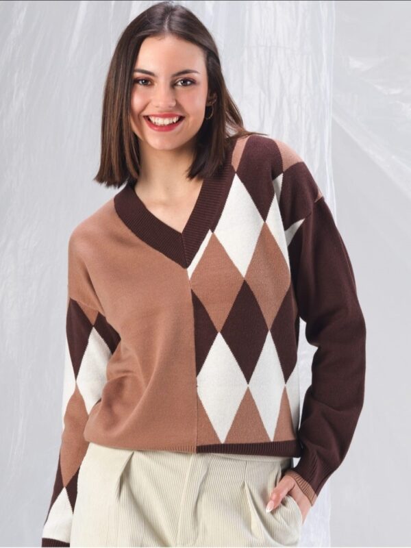 Jersey de punto con cuello en pico y manga larga. Modelo de estampación frontal combinada, mitad rombos en en tres colores y mitad lisa, y espalda lisa marrón chocolate.