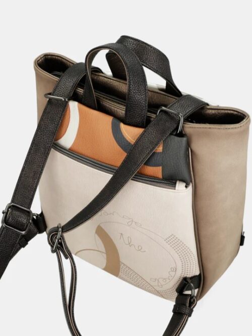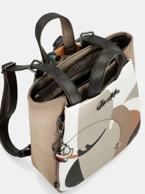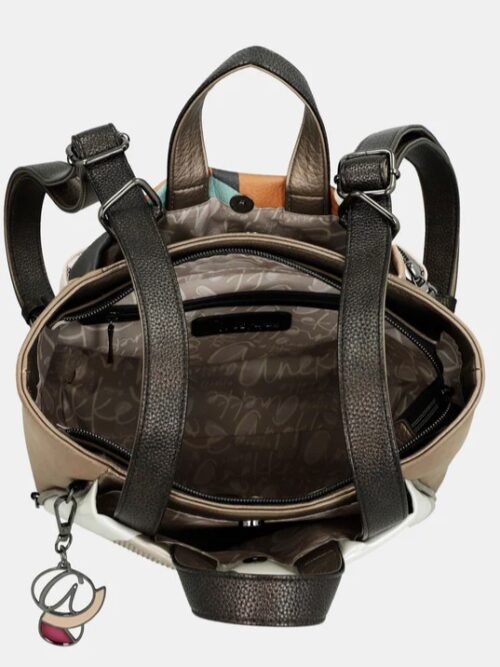 Mochila de forma cuadrada, tamaño medio-grande, con dos asas cortas, para llevar en la mano, y correas largas, ajustables, para portarla como mochila. Modelo con cierre superior de cremallera «protegido» con las correas que pasan por encima para mas seguridad. Dispone de dos bolsillos exteriores con cierre magnético uno en la parte de delante y otro en la trasera además de uno cerrado con cremallera por detrás. En el interior encontramos tres bolsillos mas, uno de ellos con cremallera, para las pequeñas cosas del día a día.