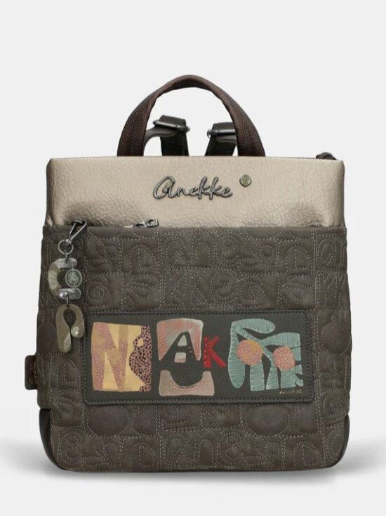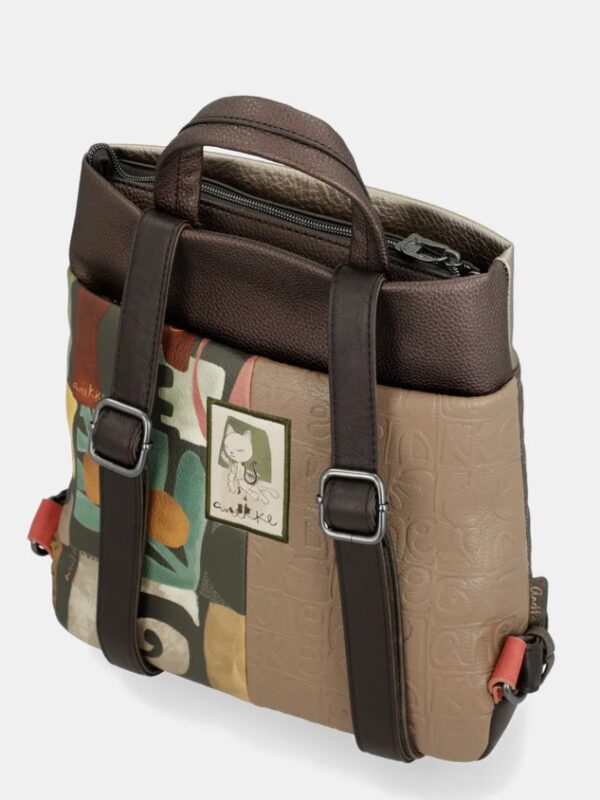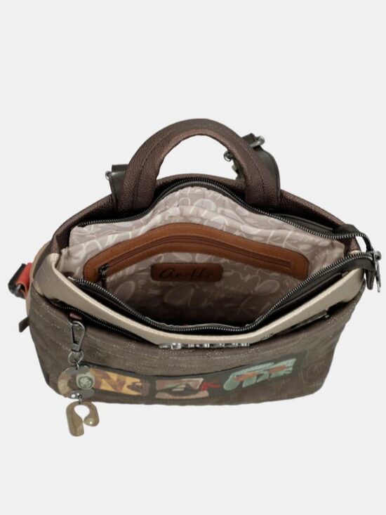 Mochila de tamaño medio con asa corta, para llevar en la mano, y correas largas, ajustables, para portarla como mochila. Modelo de cierre superior con cremallera con dos bolsillos exteriores: uno en la parte de delante y otra en la trasera cerrados con cremallera. En el interior dispone de tres bolsillos mas, uno de ellos con cremallera, para las pequeñas cosas del día a día.