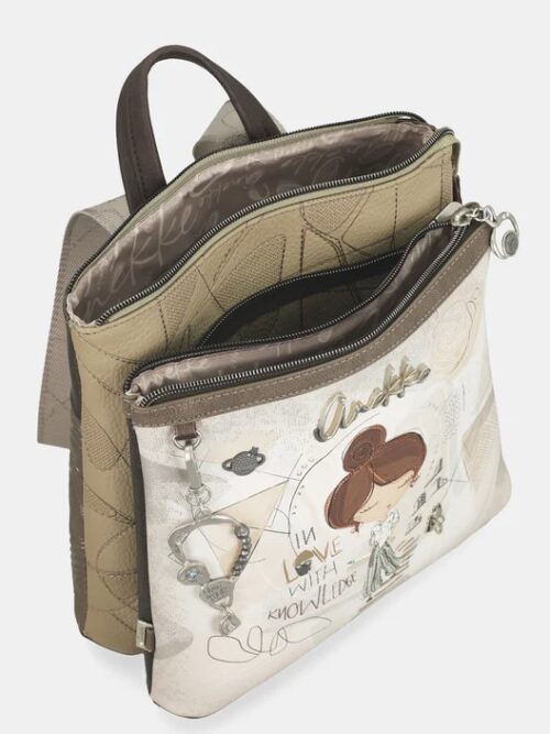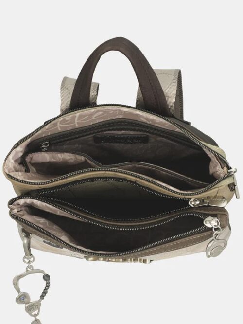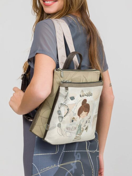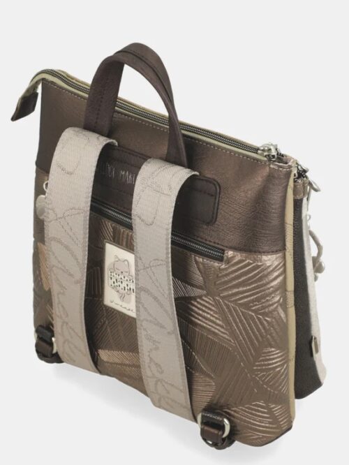 Mochila de tamaño medio con asa corta, para llevar en la mano, y correas largas, ajustables, para portarla como mochila. Modelo de tres compartimentos independientes con cierre superior de cremallera y bolsillo exterior en la trasera. En su interior dispone de tres bolsillos mas, uno de ellos con cremallera, para llevar a mano las pequeñas cosas del día a día.