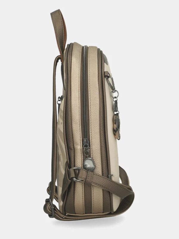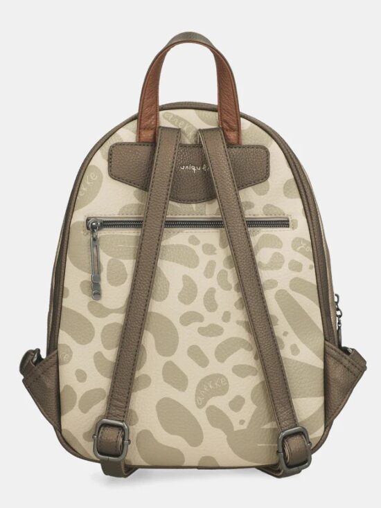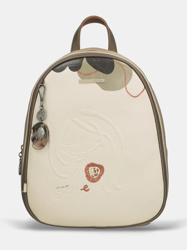 Mochila de tamaño medio diseñada con asa corta, para llevar en la mano, y correas largas ajustables a diferentes medidas para un ajuste personal. Cuenta con un bolsillo exterior cerrado con cremallera en la trasera además de dos mas en el interior para llevar a mano las cosas mas pequeñas del día a día.