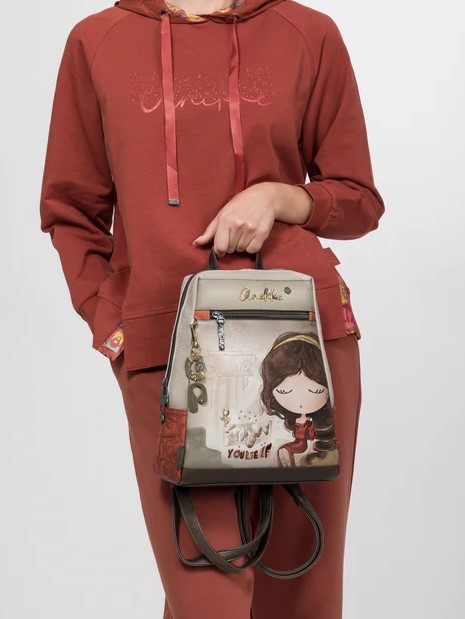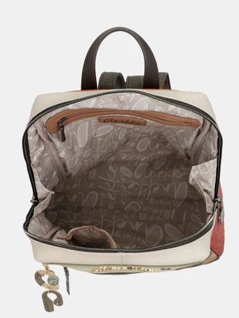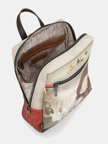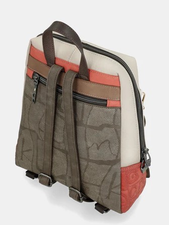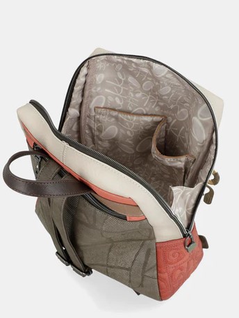 Mochila de tamaño medio, pero de gran capacidad, diseñada con asa corta, para llevar en la mano, y correas largas ajustables a diferentes medidas para un ajuste personal. Cuenta con dos bolsillos exteriores, uno por delante y otro detrás, cerrados con cremallera, además de tres mas en el interior para llevar organizadas las cosas del día a día.