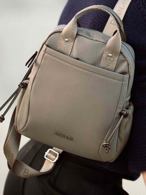 Mochila de la firma Binnari confeccionada en nylon reciclado. Cuenta con dos bolsillos fruncidos en los laterales y dos más, uno por delante y otro por detrás, con cierre de cremallera. En su interior dispone de tres bolsillos mas, uno con cremallera, para organizar las cosas mas pequeñas del día a día.