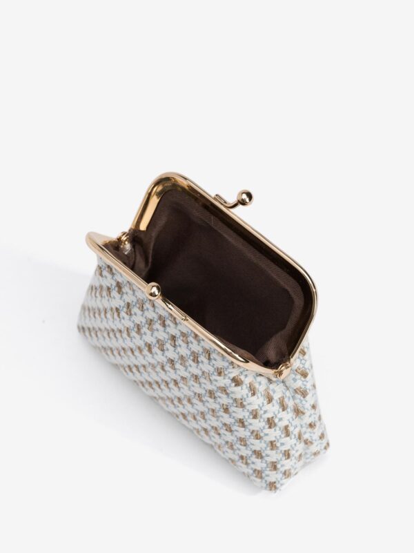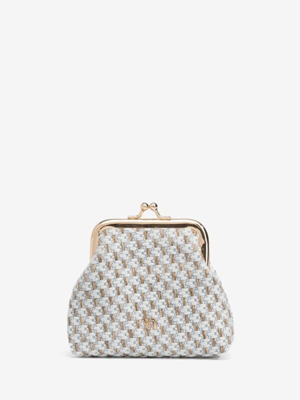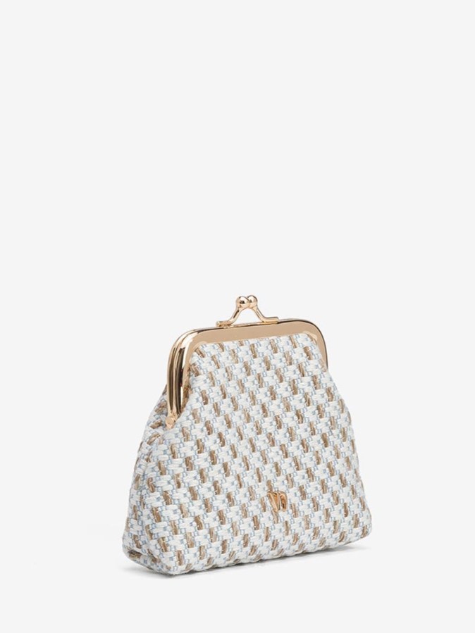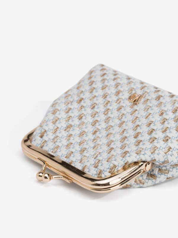 Monedero fabricado en tejido trenzado en tonos blanco roto e hilo dorado. Modelo con forro interior y cierre de boquilla metálica en color dorado. Perfecto para llevar monedas, billetes doblados o pequeños objetos organizados dentro de cualquier bolso que lleves.