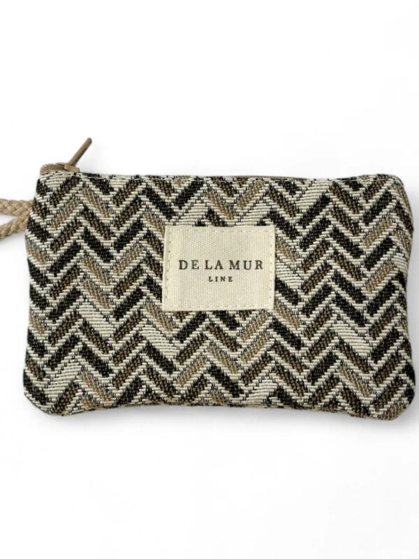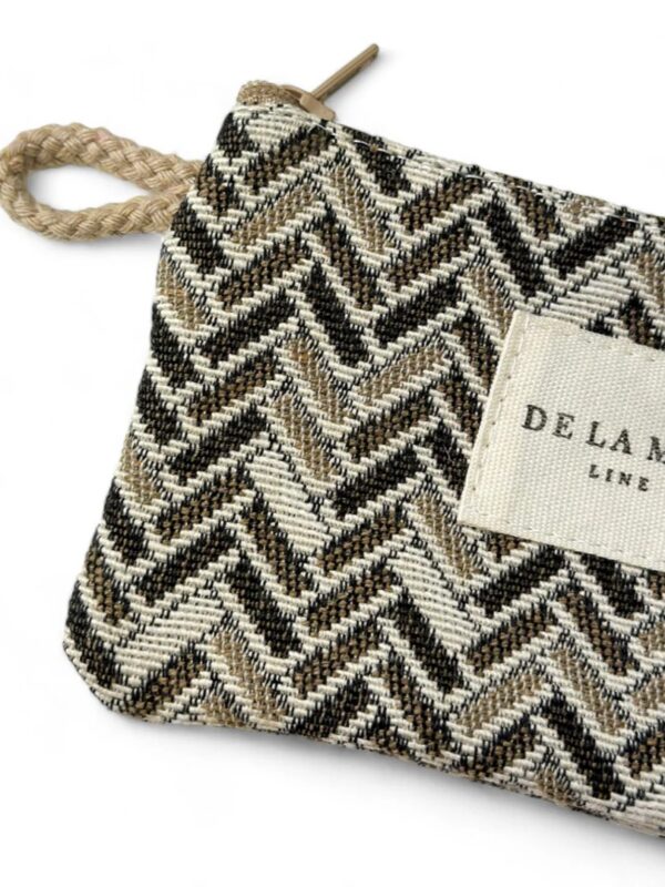 Monedero con cierre superior de cremallera y confeccionado con tejido grueso de jacquard con estampado geométrico en tonos beige y marrón. Interior forrado de tejido grueso de color gris. Su tamaño es ideal para llevar billetes, monedas y tarjetas y cabe bien dentro de cualquier tamaño de bolso.