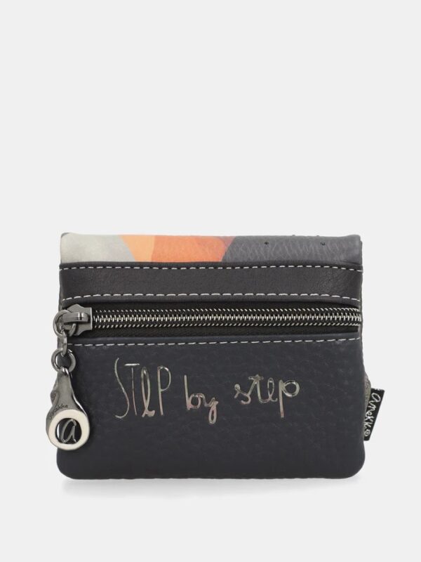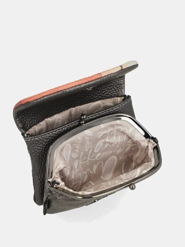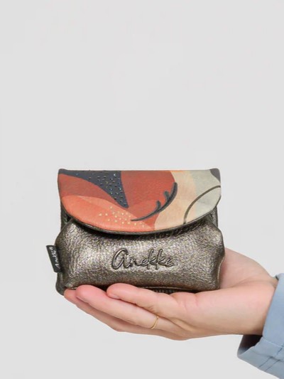 Pequeño monedero de la colección Eikon de Anekke. Modelo diseñado con dos compartimentos independientes, uno abierto y otro con cierre de boquilla, y con una solapa que cubre los dos. Cuenta con un bolsillo en la trasera, cerrado con cremallera, para llevar organizado todo lo necesario.
