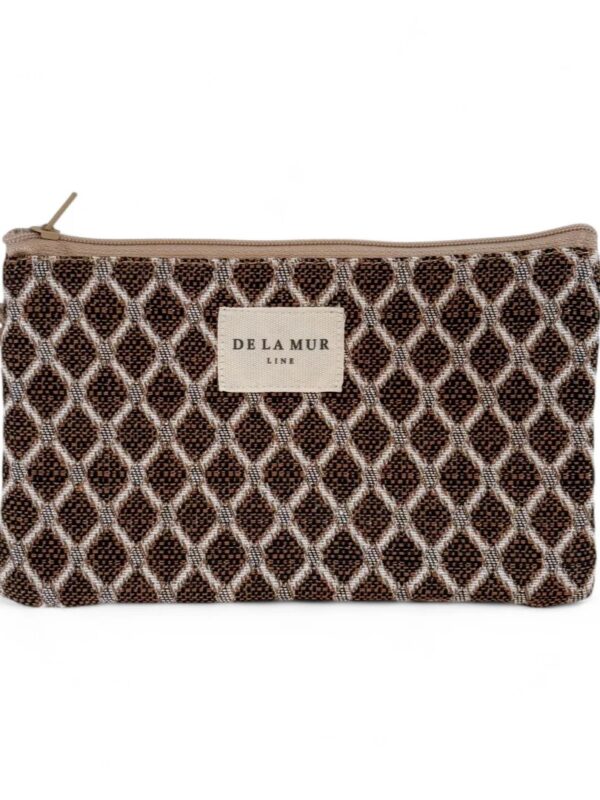 Monedero, tamaño medio, con cierre superior con cremallera. Modelo confeccionado con tejido grueso de jacquard con estampado geométrico marrón. Ideal para llevar cualquier cosita y no perderla dentro del bolso como pintalabios, tiritas, pastillas, etc.. Confeccionado con telas nacionales.