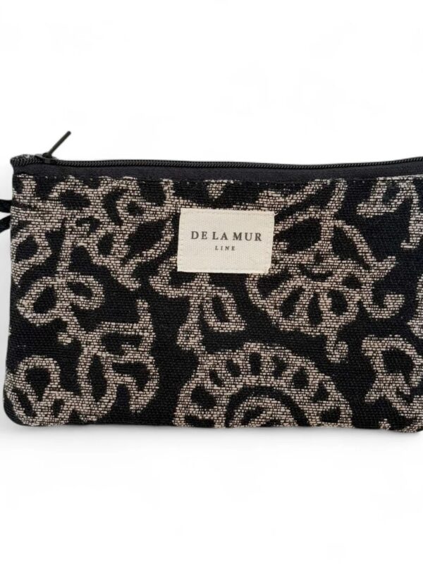 Monedero, tamaño medio, con cierre superior con cremallera. Modelo confeccionado con tejido grueso de jacquard con estampado floral de color beige sobre fondo negro. Ideal para llevar cualquier cosita y no perderla dentro del bolso como pintalabios, tiritas, pastillas, etc.. Confeccionado con telas nacionales.