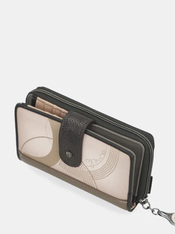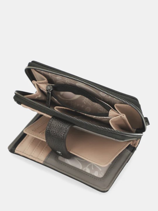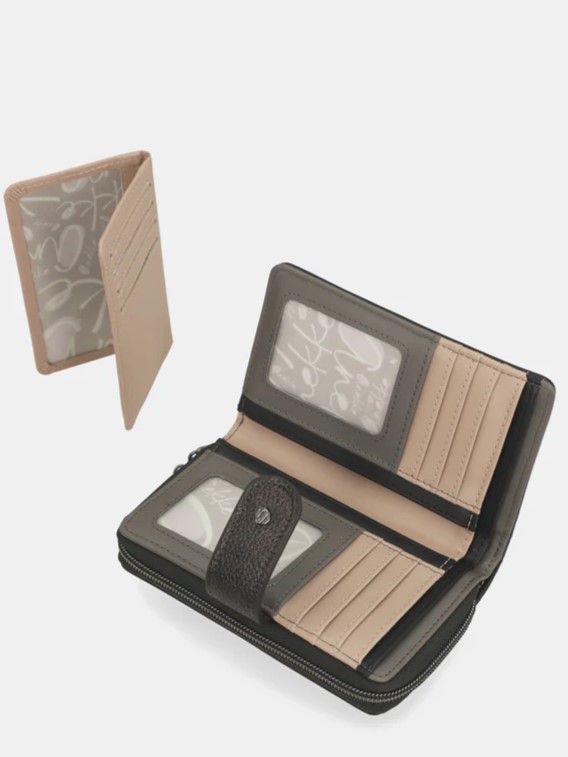 Monedero-billetero, de tamaño medio, con gran capacidad tanto para billetes y tarjetas por un lado, cerrado con solapa estrecha con clip, como para monedas, por otro, con cierre de cremallera. En su interior dispone de una pieza extraíble ideal para llevar tarjetas y documentación. Su tamaño y capacidad te permite llevarlo todo organizado dentro del bolso que elijas.