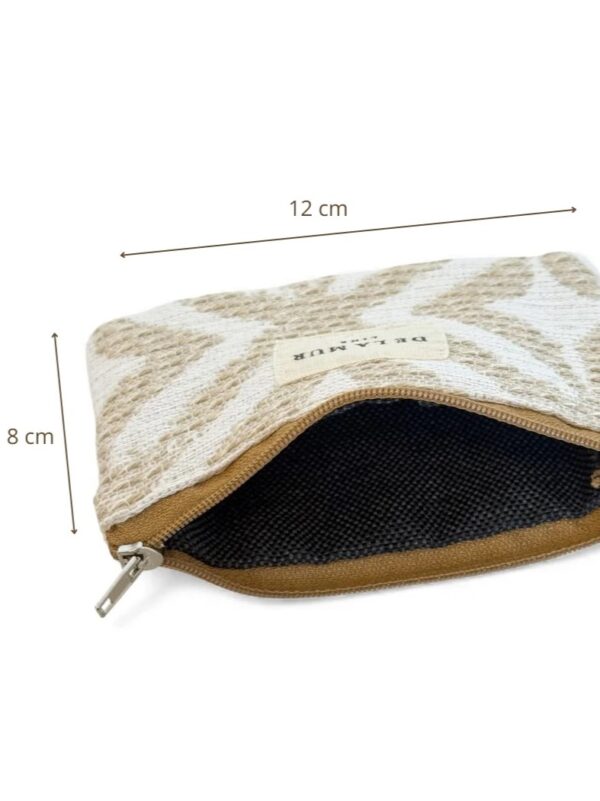 Monedero, tamaño pequeño, con cremallera en la parte superior y pequeña asa de cordón de color teja en el lateral. Modelo fabricado con tejido grueso de jacquard (80% algodón y 20% poliéster) con estampado geométrico en tonos beige y crudo y forrado de tejido grueso de color gris en la parte interior. Ideal para llevar billetes, monedas y tarjetas ya que cabe perfectamente dentro de cualquier tamaño de bolso.