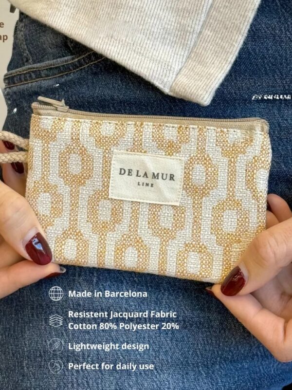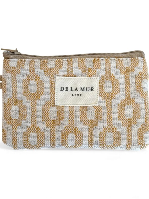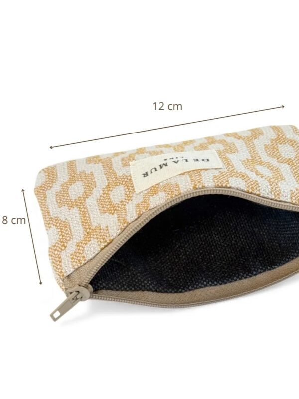 Monedero, tamaño pequeño, con cremallera en la parte superior y pequeña asa de cordón de color beige en el lateral. Modelo fabricado con tejido grueso de jacquard (80% algodón y 20% poliéster) con estampado geométrico en tono beige y mostaza y forrado de tejido grueso de color gris en la parte interior. Ideal para llevar billetes, monedas y tarjetas ya que cabe perfectamente dentro de cualquier tamaño de bolso.