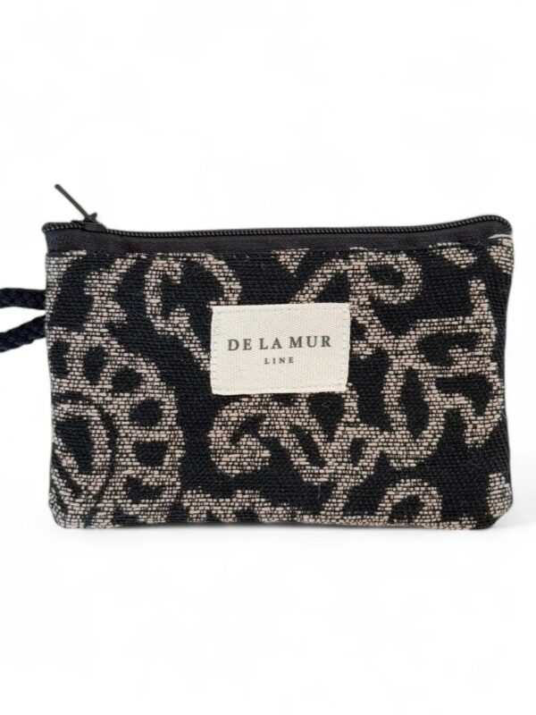 Monedero con cierre superior de cremallera y confeccionado con tejido grueso de jacquard con estampado floral beige sobre fondo negro. Interior forrado de tejido grueso de color gris. Su tamaño es ideal para llevar billetes, monedas y tarjetas y cabe bien dentro de cualquier tamaño de bolso.
