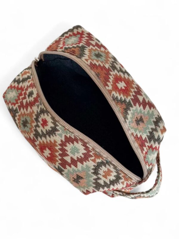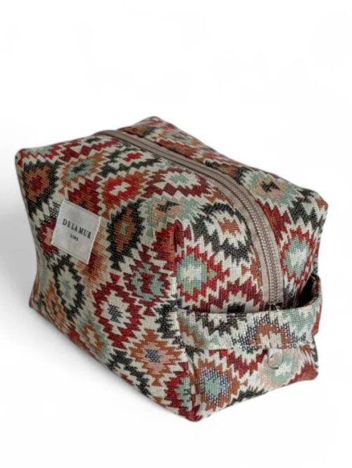 Neceser, tamaño medio, con cierre de cremallera en la parte superior y asa lateral. Modelo confeccionado con tejido grueso de jacquard de estampado geométrico multicolor. Ideal para guardar el maquillaje, las cremas faciales y botellitas pequeñas.