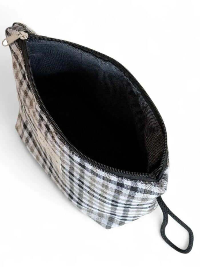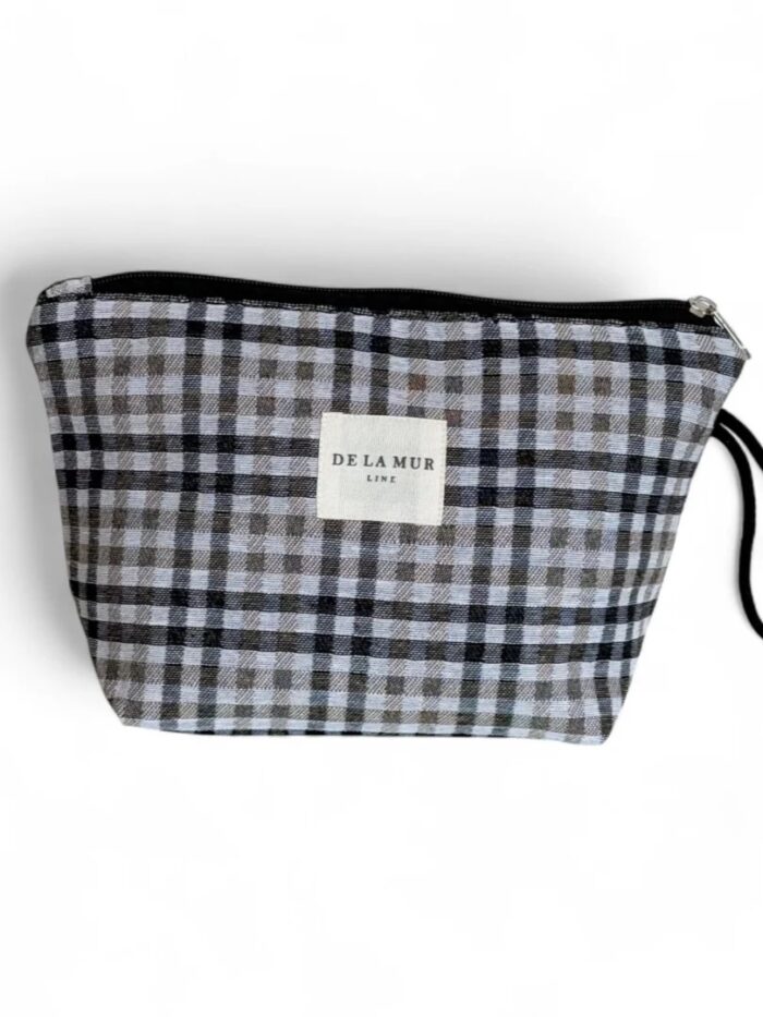 Neceser con cremallera en la parte superior y asa de cordón de color beige en el lateral. Modelo confeccionado con tejido de jacquard con estampado a cuadros en tono beige y negro. Ideal para ir de viaje, a la playa, para uso diario… Podrás llevar todo lo necesario contigo.
