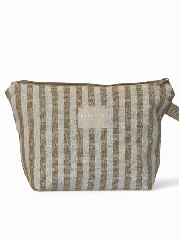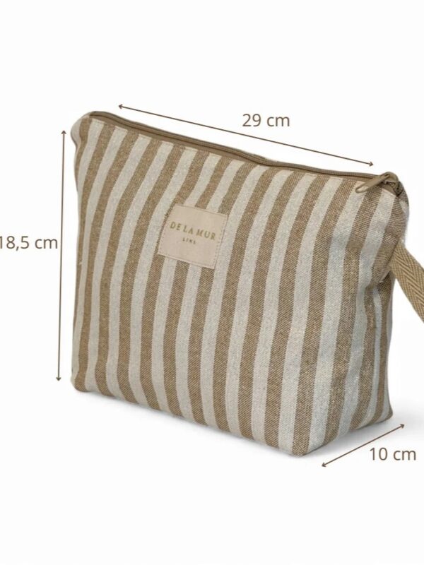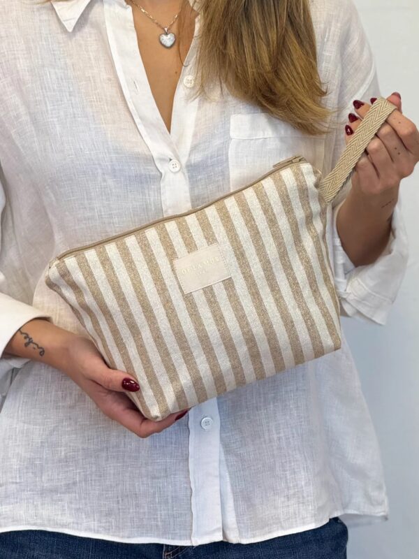 Neceser, tamaño grande, con cremallera en la parte superior y con asa lateral de cordón de color beige. Modelo confeccionado con tejido fino de half-panama (80% algodón y 20% poliéster) con estampado a rayas en tono crudo y mostaza con lurex. Su tejido con lúrex aporta ese toque de brillo que eleva cualquier look, incluso en los días más sencillos. Ideal para ir de viaje, a la playa y para uso en el día a día. Confeccionado con telas nacionales en España.