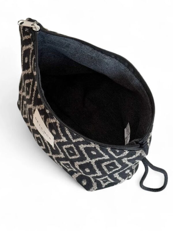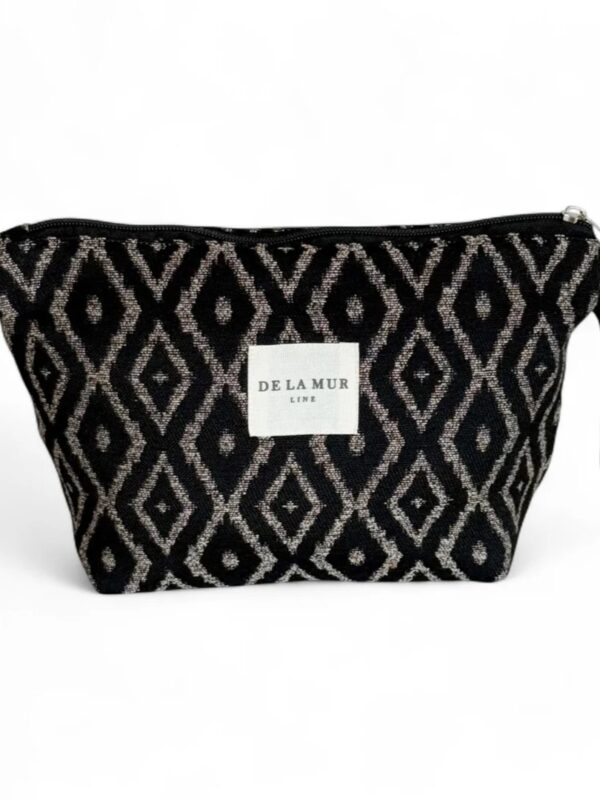 Neceser con cremallera en la parte superior y asa de cordón de color negro en el lateral. Modelo confeccionado con tejido de jacquard con estampado geométrico de color beige y negro. Ideal para ir de viaje, a la playa, para uso diario… Podrás llevar todo lo necesario contigo.